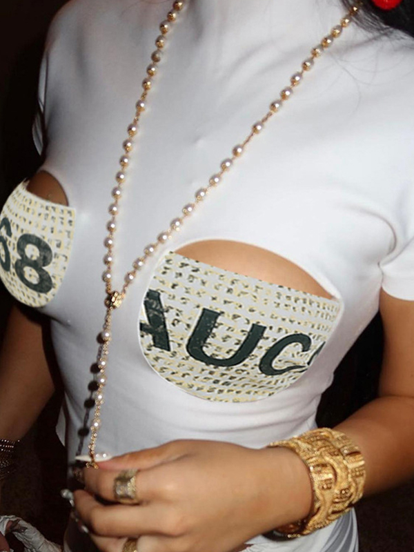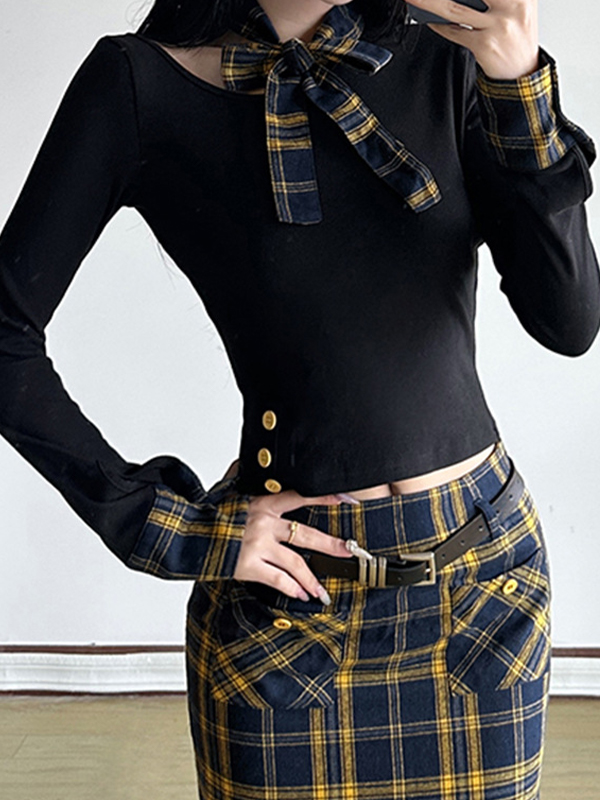 Schulterfreies Patchwork-Langarm-T-Shirt mit unregelmäßigem Saum