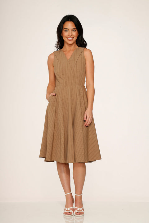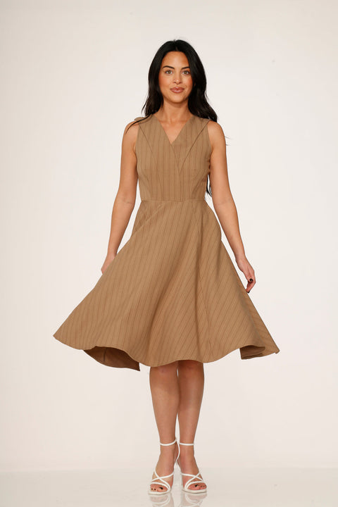 Subtiele elegantie zag er nog nooit zo goed uit. De Orchid Bloom Camel Swing Dress heeft een verfijnde V-hals en een volle, zwierige rok voor een moeiteloos stijlvolle look. De subtiele krijtstreepjes voegen diepte en charme toe, terwijl de neutrale camelkleur het een tijdloze garderobe-essential maakt.