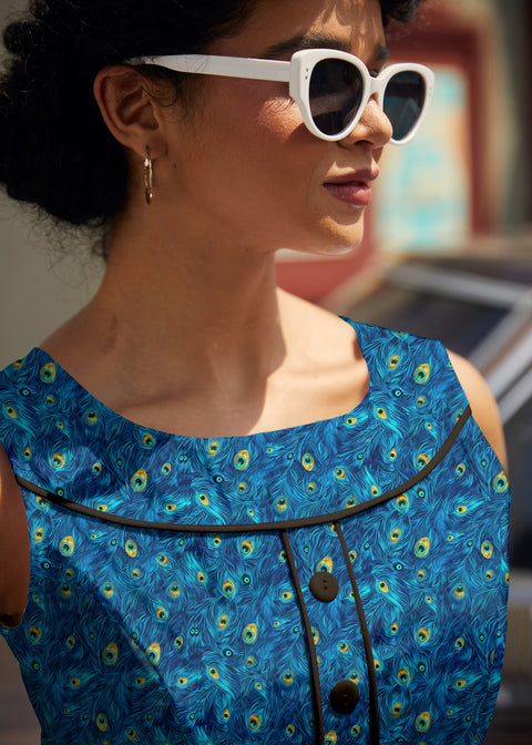 Op zoek naar een klassieke jurk in vintage stijl Onze Elizabeth-snit met al zijn details is alles wat je je kunt wensen en meer! Deze katoenen jurk, afgebeeld in onze pauwenprint, heeft biesdetails over het hele lijfje met niet-functionele knoopjes aan de voorkant, een taille met flatterende plooien, een vintage geïnspireerde, zwierige rok met verborgen zijzakken en een ritssluiting aan de achterkant.