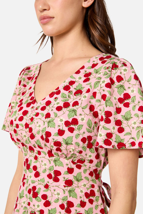Stap terug in de zoete jaren 90-nostalgie met de Raspberry Mini Dress van Princess Highway. Deze theejurk heeft een speelse print van sappige frambozen en delicate bloesems op een zachtroze basis en combineert vintage charme met een flatterend empire-silhouet. Met zwierige korte mouwen en decoratieve knoopjes is hij perfect voor zonnige wandelingen en heerlijke zomermomenten.