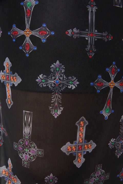 Stap in een wereld waar gotische charme en sprookjesachtige fantasie samenkomen met de Mesh Dress van Dangerfield. Deze jurk heeft soepele spaghettibandjes die de aandacht trekken naar een gewaagde, laag uitgesneden halslijn, perfect om je favoriete ketting te accentueren. De aansluitende pasvorm omarmt je rondingen op de juiste plekken en creëert een silhouet dat zowel betoverend als mysterieus is. Een unieke twist op laagjes: de doorschijnende midi-jurk laat een glimp zien van de kortere voering eronder, wat een verleidelijk kiekeboe-spelletje oplevert. Versierd met een all-over print van kruisbeelden, nodigt deze jurk uit tot intrige en gesprekken, waardoor het een opvallende keuze is voor galerie-openingen of nachtelijke feestjes onder de sterren. Gemaakt van soepel polyester, zwiert en beweegt de jurk bij elke stap. Verkrijgbaar in een mystieke zwarte kleur, is dit je ideale kledingstuk om spreuken uit te spreken of simpelweg harten te veroveren.
