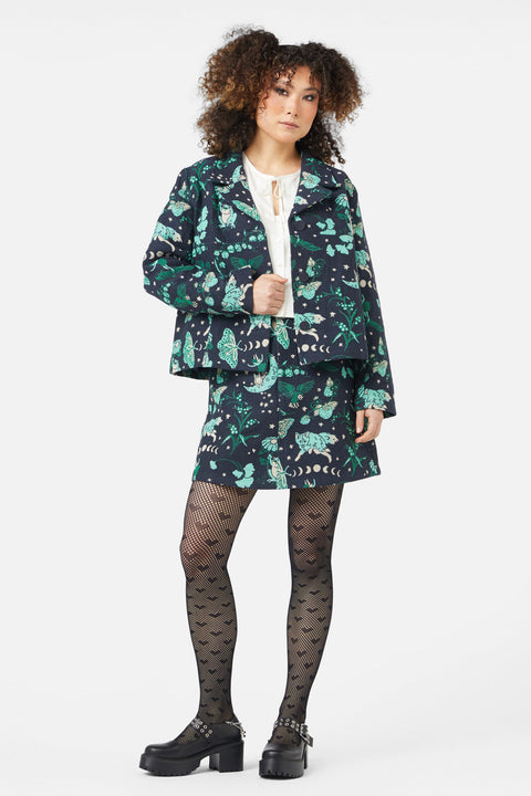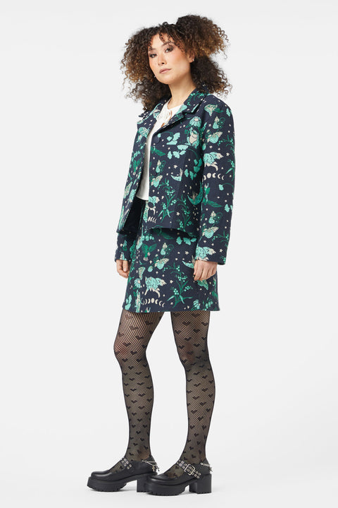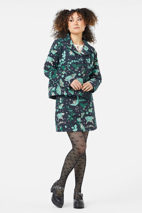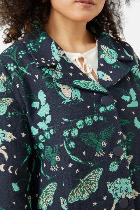 Stap in de mystieke wereld met de Forbidden Forest Jacket, een jas met ingewikkelde brokaatversiering die een unieke touch aan elke outfit geeft. Deze boxy jas heeft een gevormde kraag en een knoopsluiting aan de voorkant, wat zorgt voor een stoere look met een betoverende twist. Gemaakt van geweven brokaat, biedt het textuur en diepte, waardoor het een opvallend kledingstuk is. Verkrijgbaar in een veelkleurig patroon.