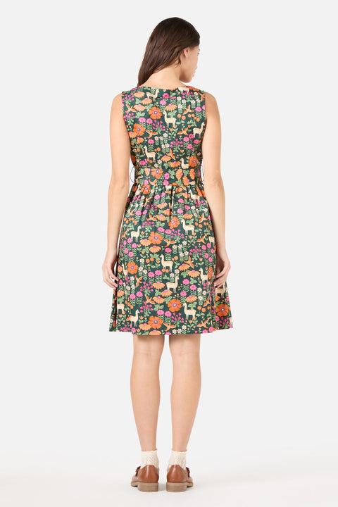 Stap in een sprookjeswereld met de Llama V-hals mouwloze jurk van Princess Highway – een speelse jurk tot halverwege de kuit, bedrukt met charmante lama’s, vogels en exotische, middeleeuws geïnspireerde bloemen. Met zijn relaxte charme en vrolijke print is hij perfect voor zonnige dagen en een wandeling over de markt. De jurk heeft een V-hals, een knoopsluiting aan de voorkant en een aansluitend lijfje met een zacht geplooide rok. Hij valt net boven de knie. Met de afneembare tailleband kun je de jurk naar wens aansnoeren. Gemaakt van 100% katoenen twill voor comfort en een gestructureerde pasvorm.
