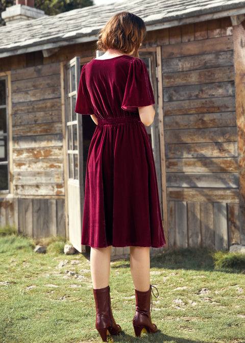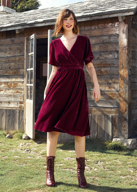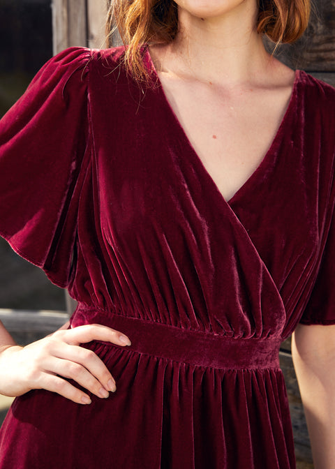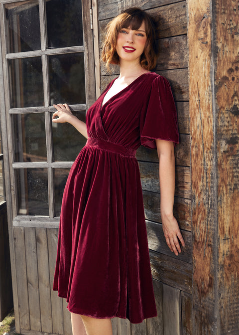 Deze zwierige fluwelen midi-jurk in een rijke, bietenrode kleur laat je er moeiteloos elegant uitzien terwijl je de kamer doorloopt. Gemaakt van een elastische fluwelen stof met een prachtige glans en een zachte textuur, heeft deze moeiteloos elegante midi-jurk korte, zwierige mouwen, een overslagkraag en een geplooide, hoge taille die overgaat in een zwierige, dromerige A-lijn rok.