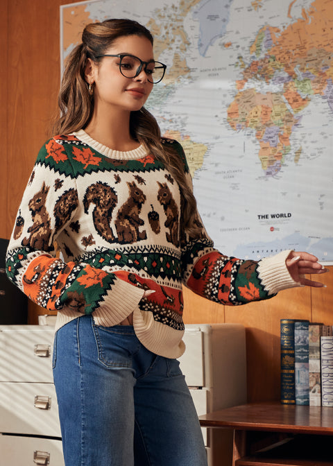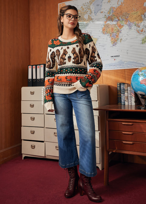 Wikkel jezelf in de knusse charme van de Notes of Nostalgia Sweater van ons eigen ModCloth-merk. Deze klassieke trui met ronde hals is gebreid van 100% katoen voor comfort en ademend vermogen en is voorzien van het Squirrel Away-design – een retro bosmotief met eekhoorns, eikels en herfstbladeren in warme seizoenskleuren. Perfect om te dragen over andere kleding op frisse dagen, het is een speelse knipoog naar vintage gebreide kleding met een moderne draagbaarheid.