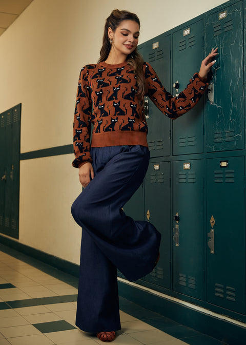 Breng een vleugje ondeugendheid in je garderobe met de Notes of Nostalgia Crewneck Pullover van ons eigen ModCloth-merk. Deze knusse trui in de kleur Rustic Purr heeft een all-over patroon van nieuwsgierige zwarte katten, waarvan de grote ogen afsteken tegen een warme roestbruine achtergrond. Met zijn klassieke ronde hals, ribboord en relaxte pasvorm is het een makkelijk te combineren kledingstuk dat geschikt is voor zowel herfstwandelingen als Halloweenfeestjes.