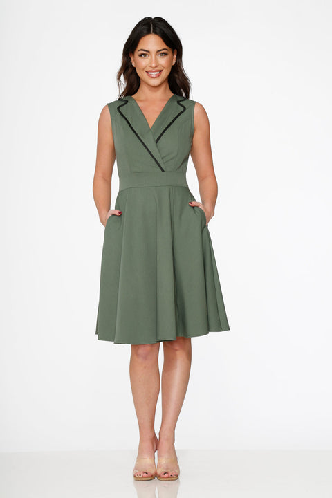 De jurk is gemaakt van een soepele polyester-spandex mix en biedt een lichte stretch voor een flatterende en comfortabele pasvorm. Met een ritssluiting middenachter en praktische zijzakken combineert de jurk vintage charme met moderne functionaliteit.