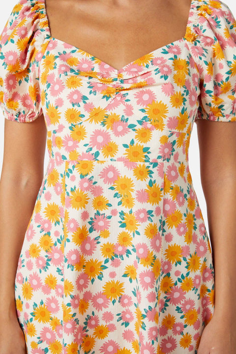 Laat je betoveren door de onweerstaanbare charme van deze mini-jurk met bloemenprint van Princess Highway. Deze jurk is versierd met een overvloed aan madeliefjes in prachtige, zachte tinten, wat zorgt voor een vintage-look die perfect is voor zonnige dagen. De sweetheart-halslijn met een geplooide voorkant voegt een vleugje romantiek toe, terwijl het geplooide achterpand zorgt voor een comfortabele en flatterende pasvorm. De jurk valt net boven de knie en heeft een speelse mini-lengte die zowel flirterig als leuk is. De pofmouwtjes met elastische manchetten voegen een speels accent toe en versterken de vintage uitstraling. Deze jurk is gemaakt van getextureerd biologisch katoen en is zowel milieuvriendelijk als stijlvol. Verkrijgbaar in crème en marineblauw, is het jouw ideale keuze voor een moeiteloze zomerstijl. Verzorging: