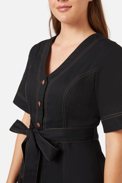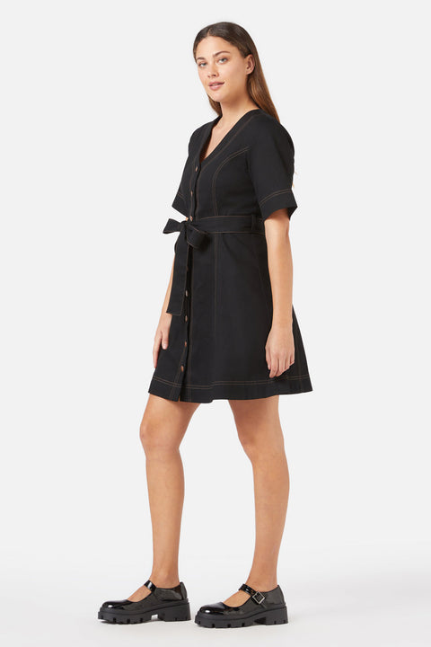 Tiana Minijurk van Princess Highway: Omarm casual chic met de Tiana minijurk in zwart denim. Deze aansluitende minijurk met uitlopende rok is gemaakt van duurzame katoenen twill voor dagelijks comfort. Met een V-hals, knoopsluiting aan de voorkant en flatterende korte mouwen is de jurk ontworpen met contrasterende beige stiksels en een afneembare tailleband voor een vleugje retro. Perfect voor een relaxte dag of een avondje uit, deze jurk combineert comfort en stijl naadloos.