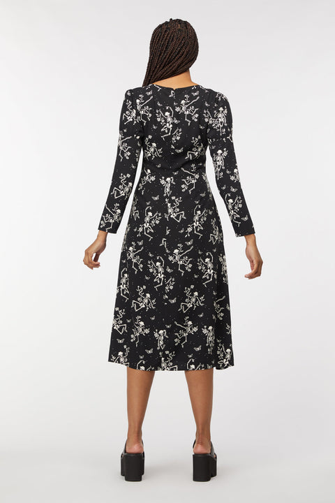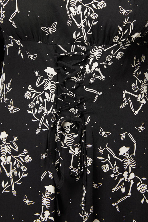 De Garden Skelly Dress van Dangerfield is een betoverende mix van gothic stijl en cottagecore vibes, perfect voor wie houdt van zowel een donkere esthetiek als een speelse charme. Deze jurk heeft lange mouwen met plooien bij de schouders, wat een vleugje drama en elegantie aan het silhouet toevoegt. De laag uitgesneden, vierkante halslijn versterkt de gothic allure, terwijl de korsetachtige strik aan de voorkant de jurk prachtig accentueert en zorgt voor een flatterende pasvorm.