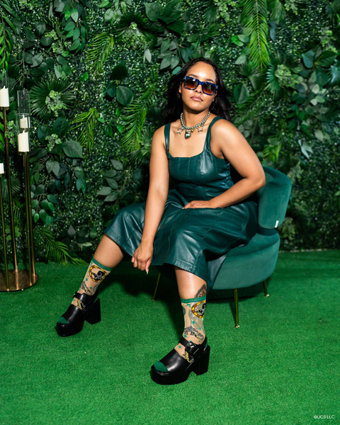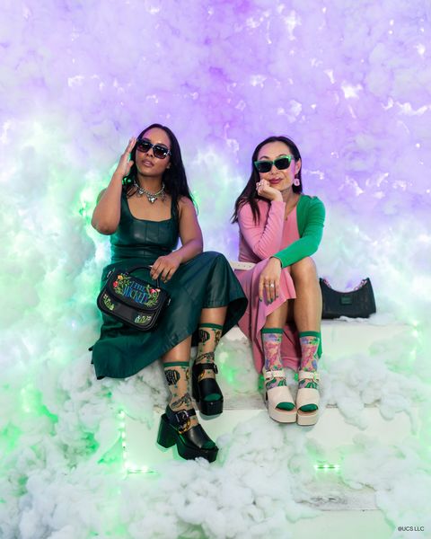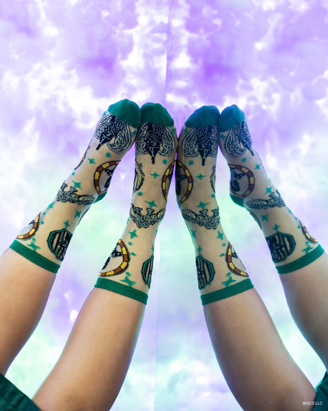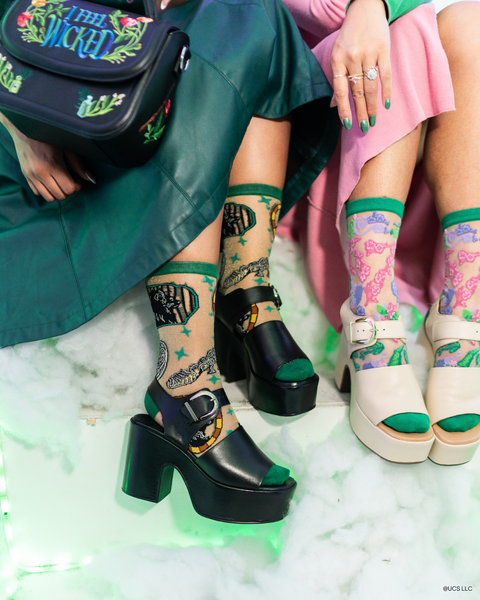 De hele bende is hier in onze All Road Lead to Oz glinsterende, transparante sokken. Met het Wicked: For Good-ensemble van Dorothy, de Blikken Man, de Vogelverschrikker en de Leeuw, viert dit oogverblindende ontwerp hun reis naar het Land van Oz. De sokken zijn uitgevoerd in een groene, glinsterende transparante stof en afgewerkt met een groene boord, teen en hiel als knipoog naar de Smaragdstad. Haal dit aandenken aan het Land van Oz voor jezelf in huis.