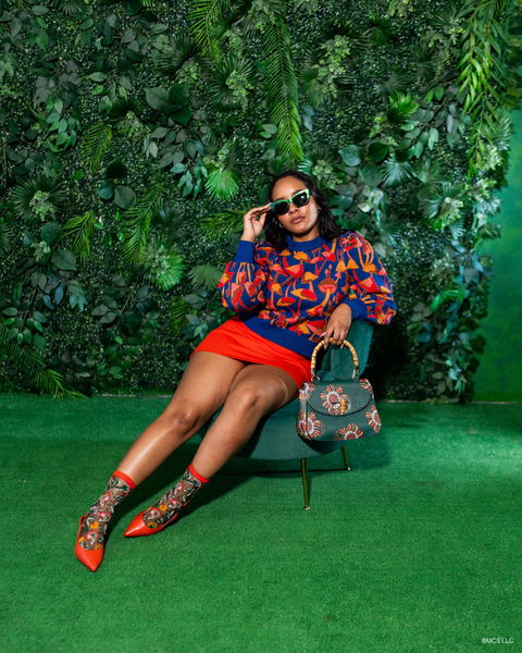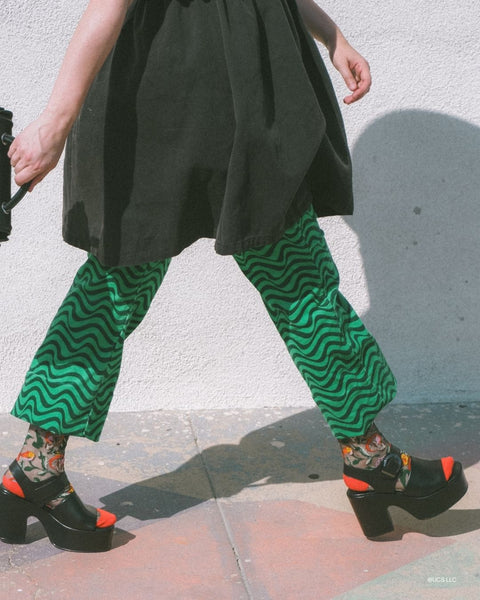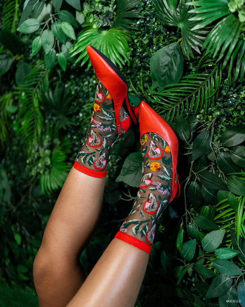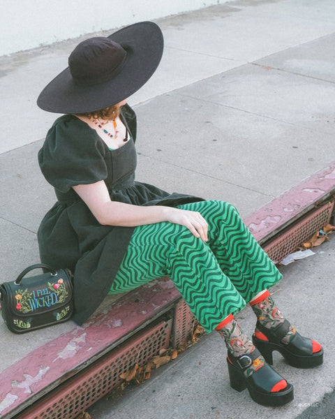 Stap in de wereld van Elphaba met de Elphaba Land Mushroom Black Sheer Sock, met wilde paddenstoelen en klaprozen in levendige tinten rood, oranje en geel. Dit ontwerp vertegenwoordigt het Oziaanse bos waar Elphaba woont en is uitgevoerd in een zwarte, transparante stof voor een stoere look. Afgewerkt met een klaproosrode boord, teen en hiel voor een onverwachte kleuraccent.