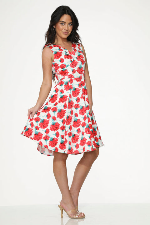 Romantiek bloeit altijd met de Orchid Bloom White&Red Rose Swing Dress. Deze vintage-geïnspireerde schoonheid, met een tuin vol felle rode rozen op een helderwitte achtergrond, is zowel klassiek als betoverend. Met zijn flatterende aansluitende lijfje, wijde swingrok en zachte, elastische katoenmix is hij perfect voor picknicks, feestjes of je volgende adembenemende entree.