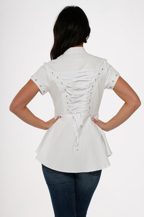 Een frisse en moderne top met asymmetrische zoom in wit, met een flatterend silhouet en praktische zijzakken. Dankzij de comfortabele stretch en de ritssluiting aan de voorkant is dit veelzijdige item gemakkelijk te combineren met broeken, rokken of jeans voor zowel casual als meer geklede looks.