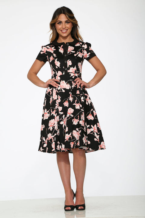 Vrouwelijk met een vleugje drama: de zwarte en roze bloemenjurk van Orchid Bloom heeft levendige roze bloemen die bloeien tegen een klassieke zwarte achtergrond. Het flatterende swingmodel voegt een vintage-geïnspireerde elegantie toe, perfect voor date-avonden, tuinfeesten of speciale gelegenheden.