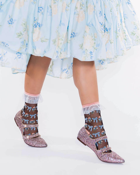 Geïnspireerd door het Bridgerton Regency-tijdperk, is deze enkelsok met ruches voorzien van pastelkleurige bloemen en schattige strikjes op een zwarte, doorschijnende stof. Afgewerkt met een witte, doorschijnende ruchesrand voor een extra meisjesachtige look. De bijpassende sok bij de Repeat Floral Ruffle Sheer Sock – koop er een voor jezelf en een voor je beste vriendin! Eén maat. Aanbevolen voor dames met schoenmaat 5,5-10 (Amerikaanse maten). 200 naalden. Funky maar elegant – geen gekke of kinderachtige patronen. Premium kwaliteit – duurzaam gemaakt met comfortabele stretch. Uniek – het perfecte accessoire om je outfits een persoonlijk tintje te geven.