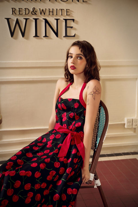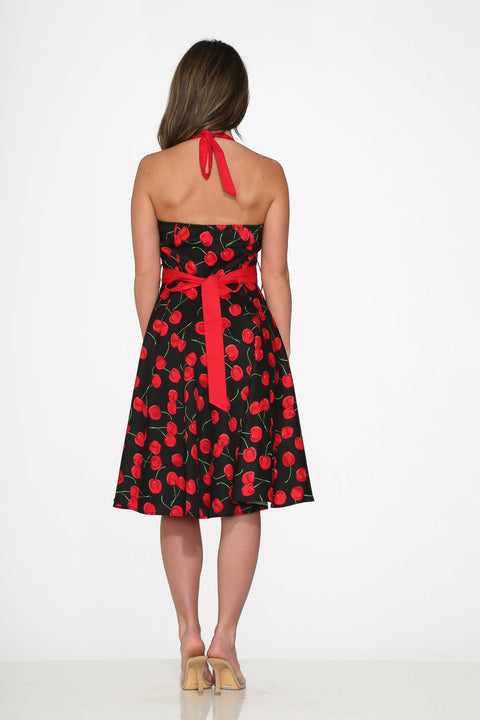 Omarm de klassieke pin-upstijl met de Black&Red Cherry Halter Dress van Orchid Bloom. Deze swingjurk met halterhals heeft een opvallende rode kersenprint op een elegante zwarte achtergrond en geeft een vintage flair aan warme dagen en leuke avonden uit.