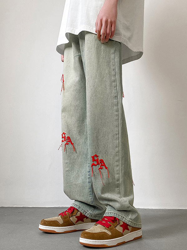 Slim Straight Herrenjeans in blauer Waschung mit Stickerei
