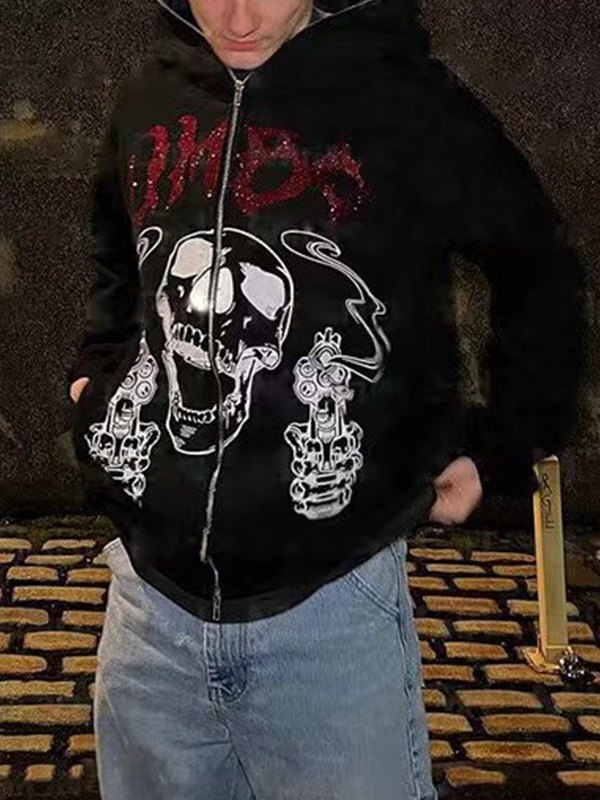Herren-Hoodie mit Strass-Buchstabe und Totenkopf, schwarz