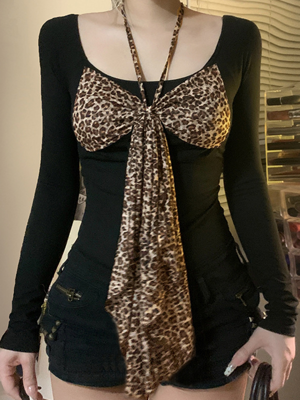 Neckholder-T-Shirt mit Leopardenmuster und Schleife