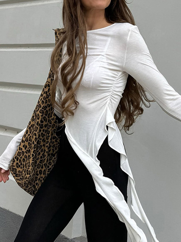 Einfarbiges, langärmliges T-Shirt mit Rüschen