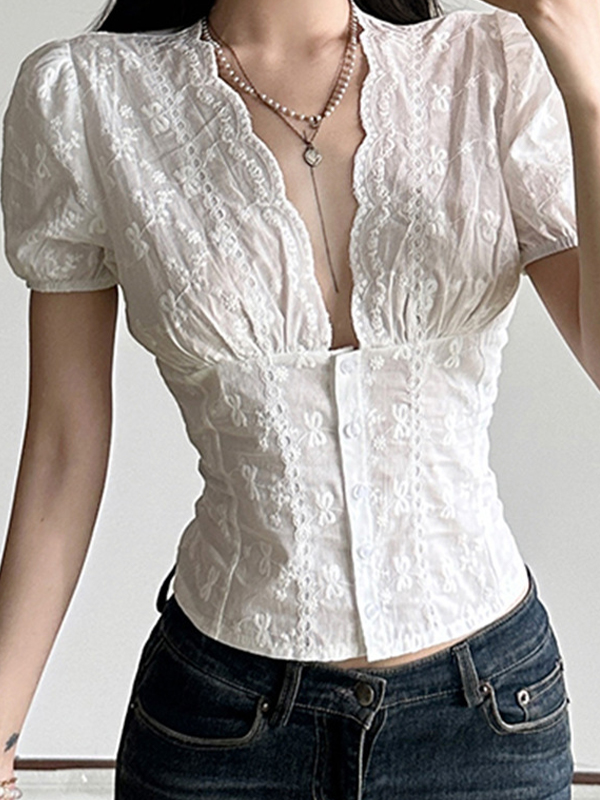 T-Shirt mit V-Ausschnitt und kurzen Ärmeln aus Spitze