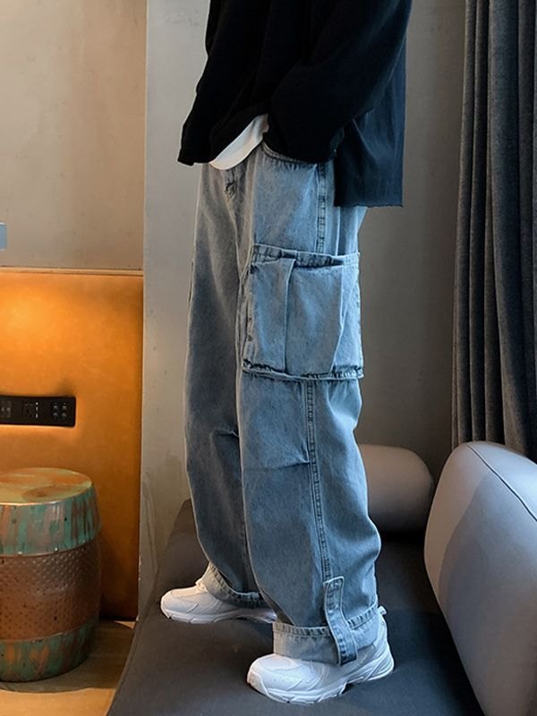 Stil: Casual/Street/Hip Pop/Punk Farbe: Blau Hauptmaterial: Baumwollmischung Passform: Lockere Passform Design: Diese gewaschene Jeans hat eine entspannte Passform, mit aufgesetzten Cargotaschen und einem Reißverschluss. Komplett mit Klettverschluss an den Manschetten.