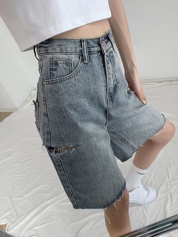 Stil: Casual/Street/Vintage/Basics Material: Baumwollmischung Passform: Normale Passform Design: Diese unverzichtbaren Jeansshorts haben eine gerade Beinpassform, sitzen in einer hohen Silhouette, sind mittellang und haben einen unversäuberten Saum. funktionales Taschendesign und ein Reißverschlussknopfverschluss.
