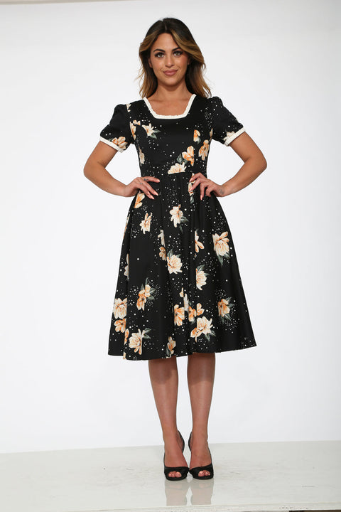 Blauwe swingjurk met Hawaïaanse palmbomenprint